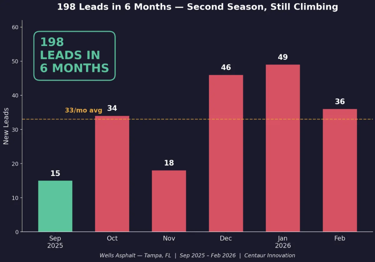 By the time we added paid ads in October 2025, the organic engine was already humming. Then the numbers took off: 34, 46, 49 leads per month. Their best season pulled in 198 leads across six months, averaging 33 per month in a market where they started at one.