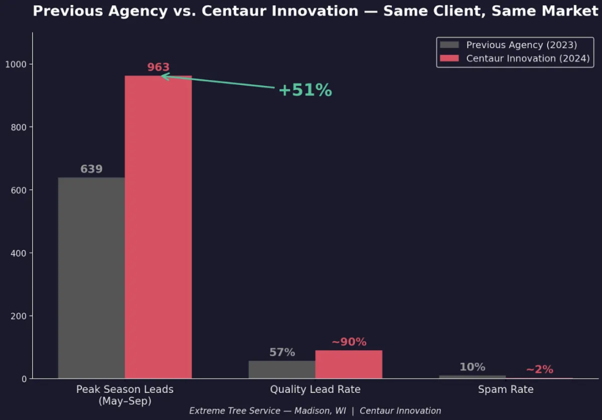 Extreme Tree Service was already a well-known name in the Madison area. They'd been with a national agency that was spending their budget and delivering results — but not great results. Lead quality was inconsistent, spam rates were high, and they knew they were leaving money on the table.