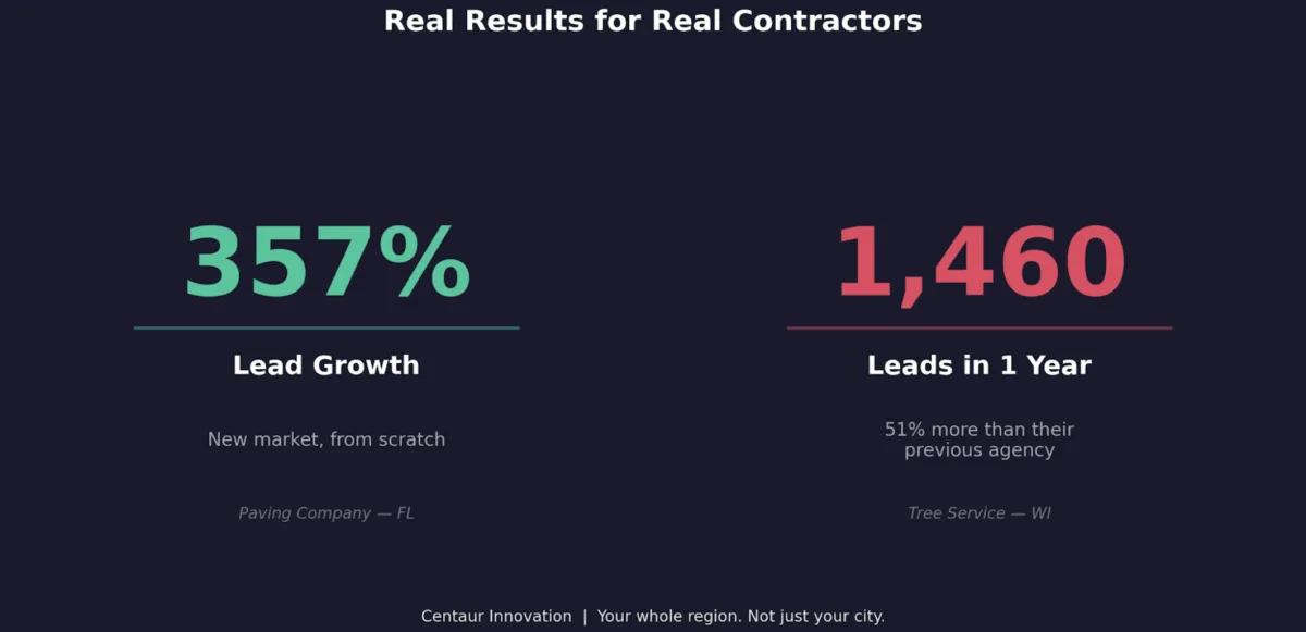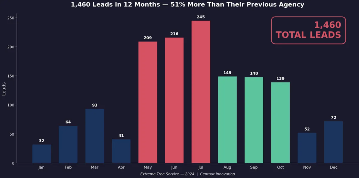 357% lead growth for a paving company entering a brand new state. 1,460 leads in one year for a tree service — 51% more than their previous agency delivered.